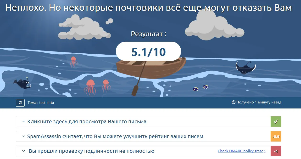Процесс работы простой: заходите на сайт, получаете уникальный адрес и отправляете на него свое письмо из CRM, SMTP или обычного почтового клиента. Затем нажимаете кнопку проверки и видите подробный отчет с оценкой по шкале и блоками: контент, заголовки, DNS-записи, blacklists, технические предупреждения. Сервис хранит результат теста ограниченное время: в бесплатной версии отчет доступен около недели, а при создании учетной записи и использовании собственного префикса — заметно дольше, до месяца, что удобно для отслеживания правок. Важно помнить, что новое письмо на тот же тестовый адрес сразу стирает предыдущий отчет и заменяет его свежим результатом.