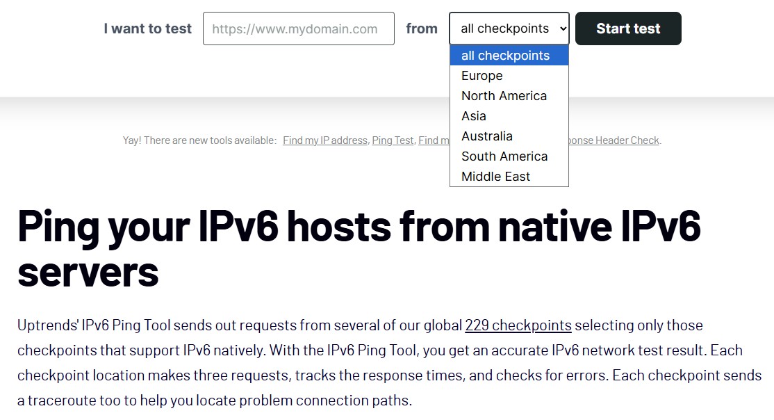 Сервис Free IPv6 Ping Test Tool от Uptrends — это удобное бесплатное решение для мгновенной проверки доступности сетевых ресурсов по протоколу IPv6 из различных точек мира. Этот инструмент экономит массу времени, позволяя за считанные секунды увидеть реальную картину доступности сайта или сервера из Европы, Северной Америки или Азии, что делает его гораздо эффективнее стандартных методов диагностики. Этот инструмент давно входит в мой личный стек инструментов, так как он реально помогая проверять доступность IPv6 инфраструктуры без лишней головной боли.
